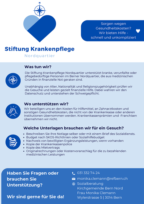 Genau in solchen Fällen springt die Stiftung Krankenpflege für das Nordquartier ein. Zweck der Stiftung ist die Unterstützung von Menschen aus dem Nordquartier, die wegen gesundheitlichen Einschränkungen in finanzielle Not geraten sind. Was heisst das konkret? Lesen Sie hier mehr
